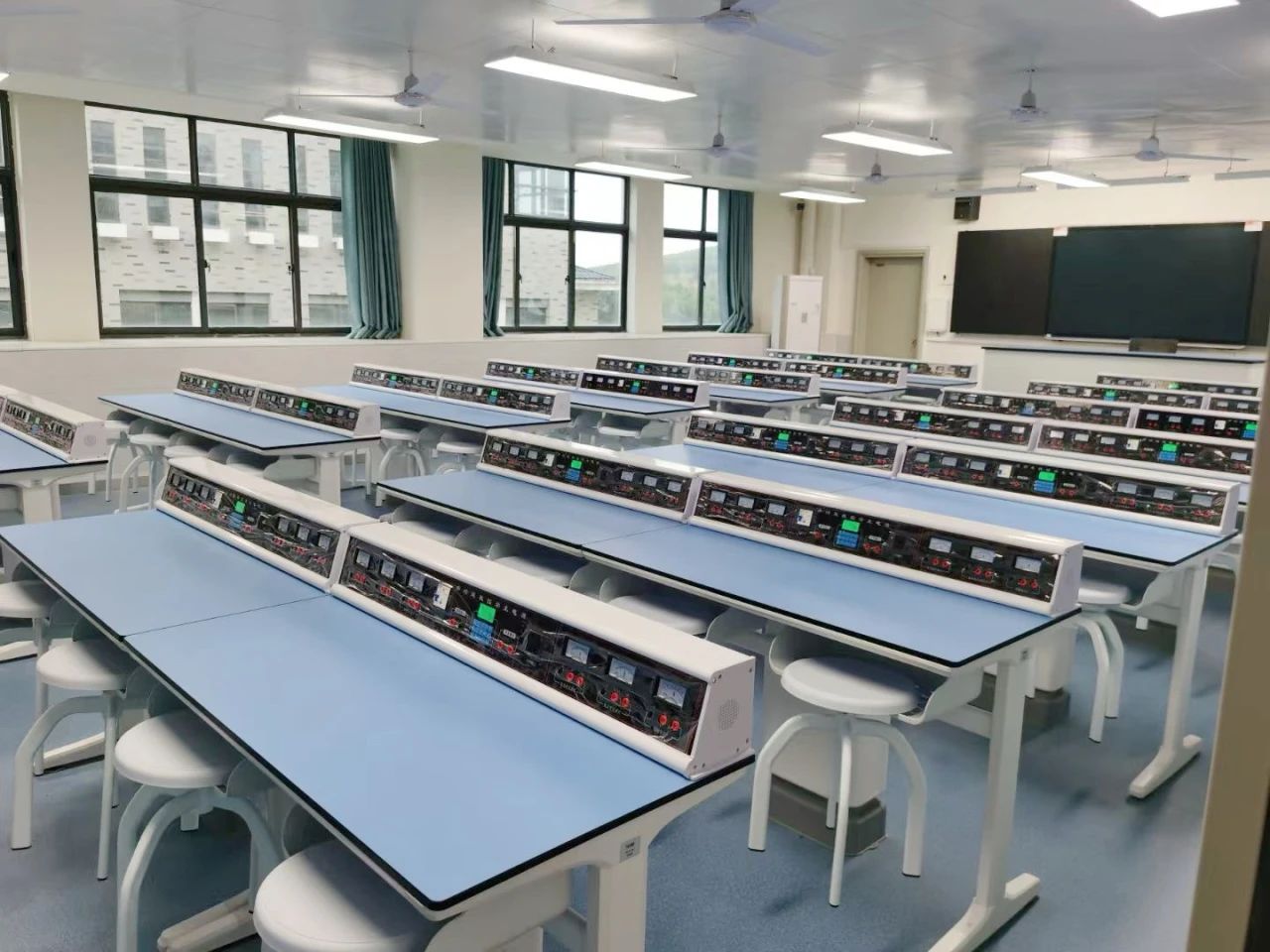 物理電學實驗室主要由電學六表電源、學生實驗桌椅及教師演示臺等核心設(shè)備構(gòu)成。學生電學電源采用鋁合金外框設(shè)計,安置于桌面之上,兩側(cè)分別配備了以下設(shè)備:兩個量程為0.6-3A的電流表、兩個量程為3-15V的直流電壓測試表、兩個靈敏電流計測試表。此外,220V交流輸出端口采用新國標五孔插座設(shè)計,并配備過載保護功能,確保用電安全。