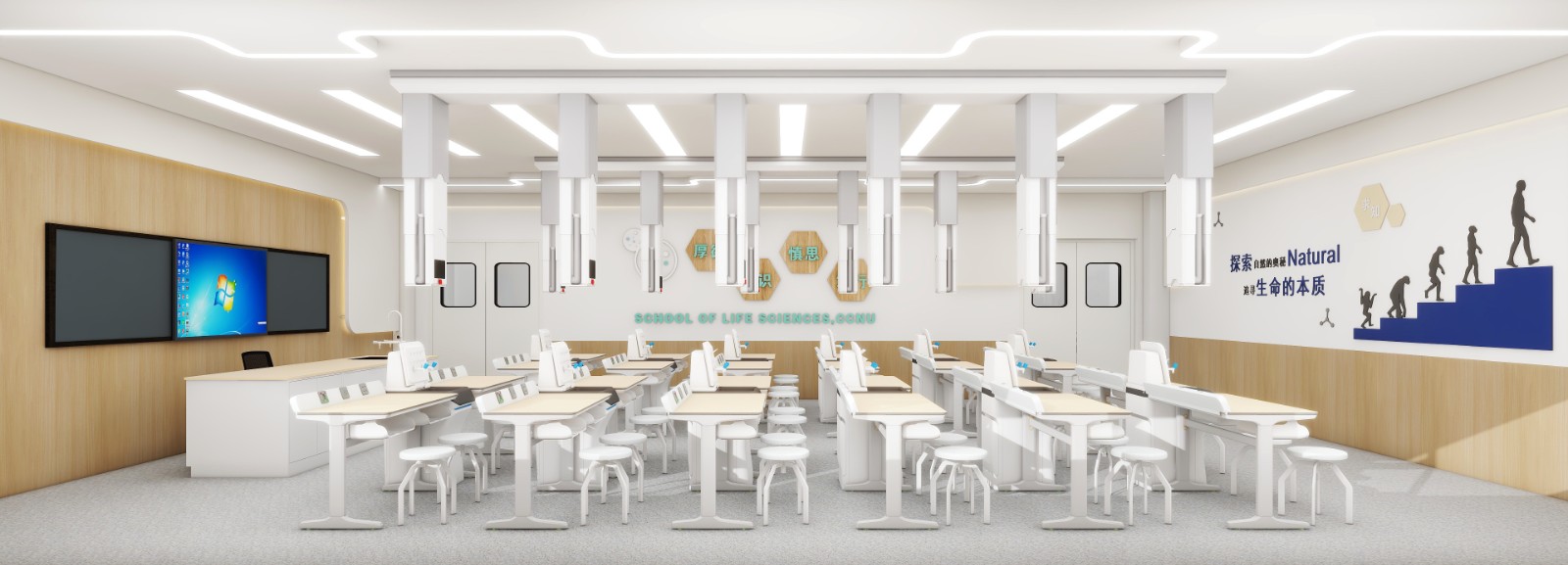 講實(shí)驗(yàn)室所需水、電、光、網(wǎng)絡(luò)等媒介全部至于頂部,為學(xué)科教室的實(shí)驗(yàn)應(yīng)用提供了靈活性。